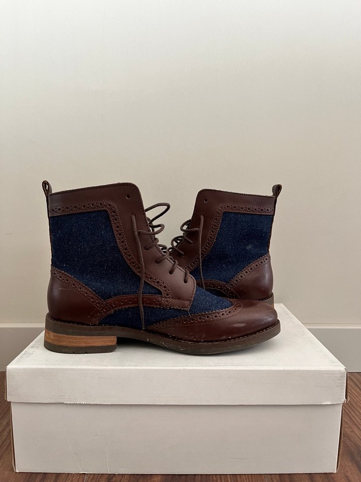 Kahverengi dolgu topuklu kadın botları, denim paneller ve tokalı detaylarla klasik ve çağdaş tarzı günlük kullanıma sunar.