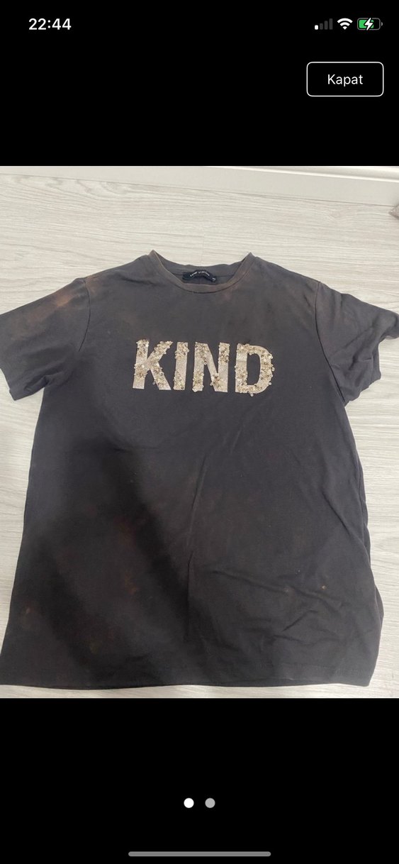 Denim kumaştan, bol kesim kısa kollu kız tişörtü. Üzerinde "KIND" baskısı bulunan, rahat ve şık sokak tarzı tişört.
