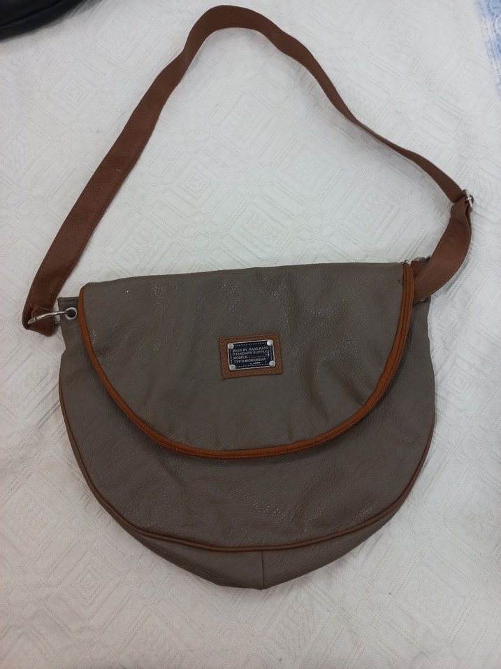 Kahverengi ve gri deri, ayarlanabilir askılı, kemerli tasarımlı kadın çantası. Geniş az kullanılmış