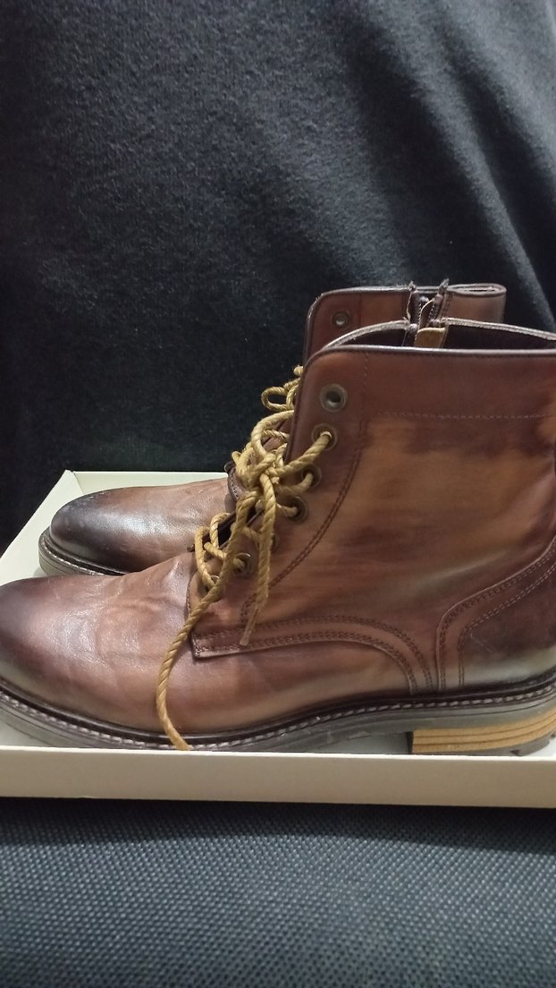 Parlak kahverengi deri erkek botlar, bağcıklı ve tokalı detaylara sahip, klasik ve bohem tarzıyla günlük kullanıma uygundur.