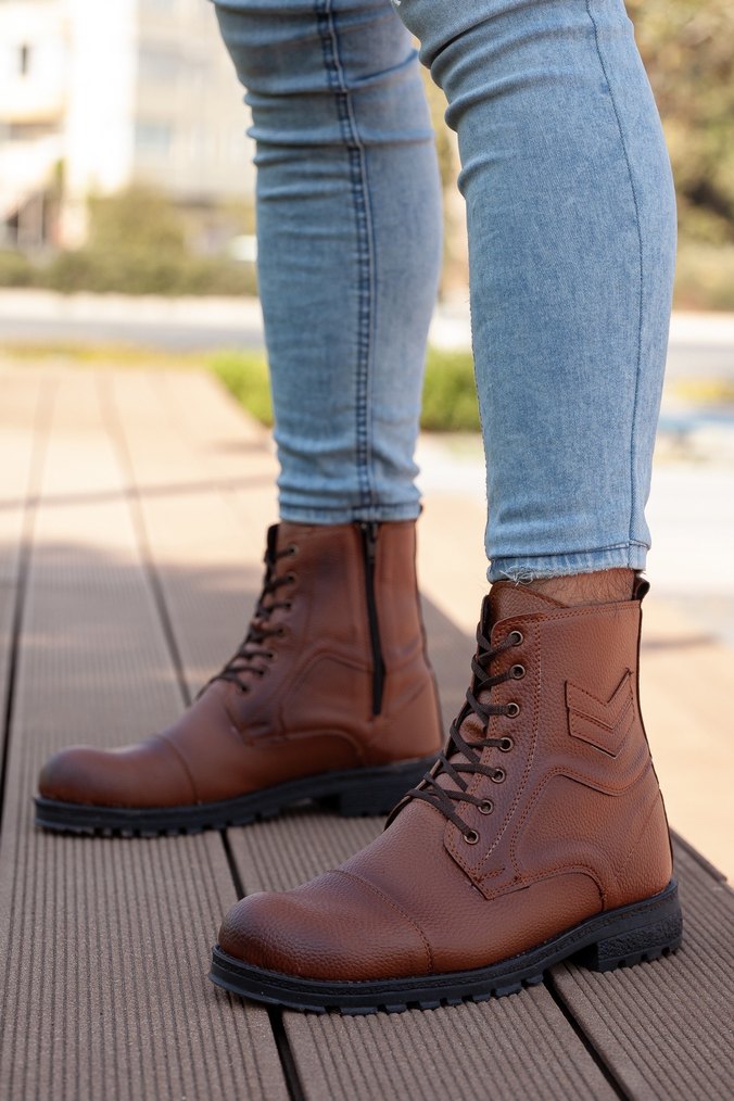 Parlak kahverengi deri bağcıklı erkek botlar, sokak stili ve günlük kullanım için uygundur. Desensiz ve trend bir görünüme sahiptir. Birinci kalite ürün kaymaz kauçuk taban damarlı malzeme yumuşak kırılma ve iz yapmaz standart kalıp numarasına uygun