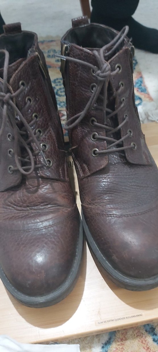 Koyu kahverengi deri erkek botlar, bağcıklı ve tokalı tasarımıyla grunge punk ve karşı kültür stilini yansıtıyor.yuzde yüz hakiki deri kislik bot