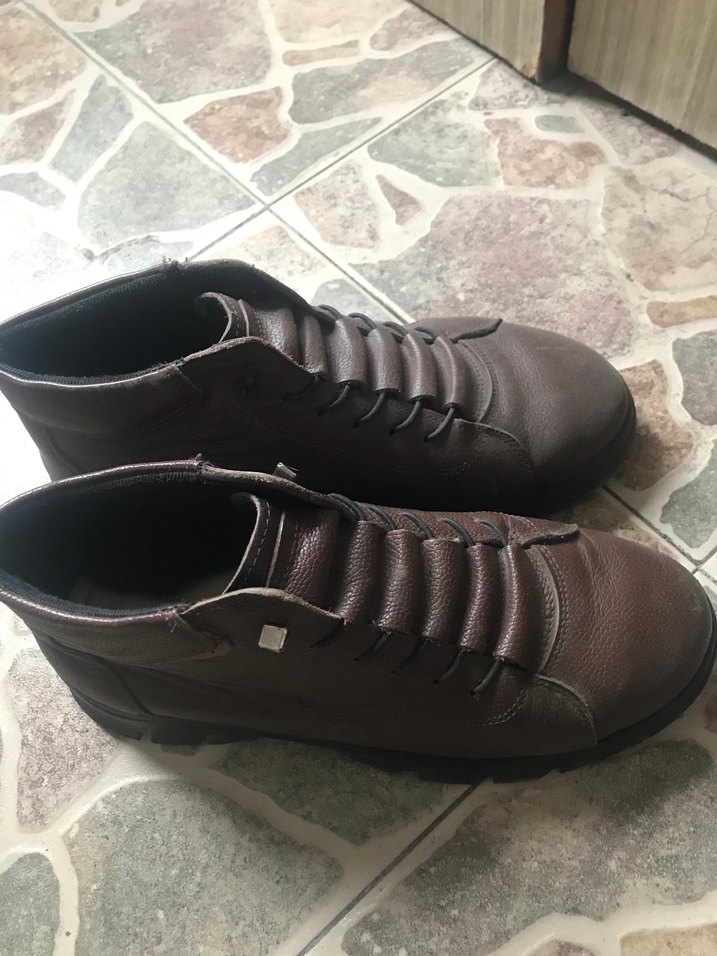 Koyu kahverengi deri, bağcıklı erkek botları. Sokak tarzı ve günlük kullanım için uygundur. Desensiz ve şık görünümlüdür.