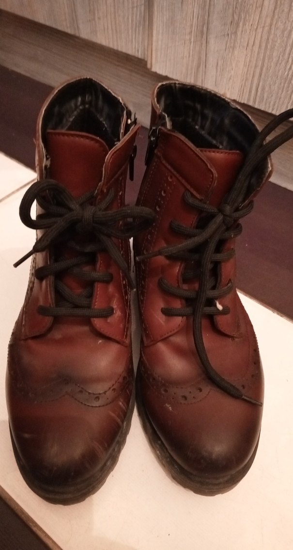 Kahverengi deri, yüksek topuklu ve bağcıklı kadın botları, gotik tarzıyla günlük kullanıma uygundur.