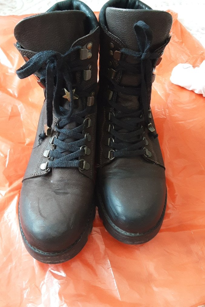 Kahverengi deri, bağcıklı ve tokalı yüksek topuklu botlar. Gotik ve punk rock tarzını yansıtan koyu renkte, desensiz tasarım.