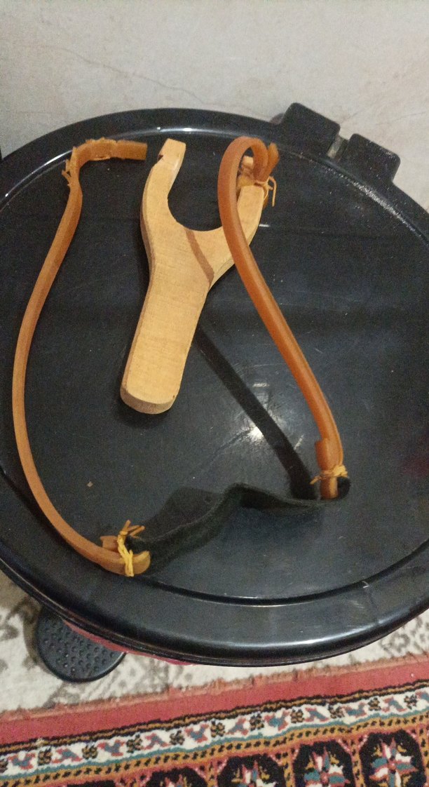 Koyu kahverengi deri bantlara sahip, klasik tasarımlı ahşap mancınık oyuncak.