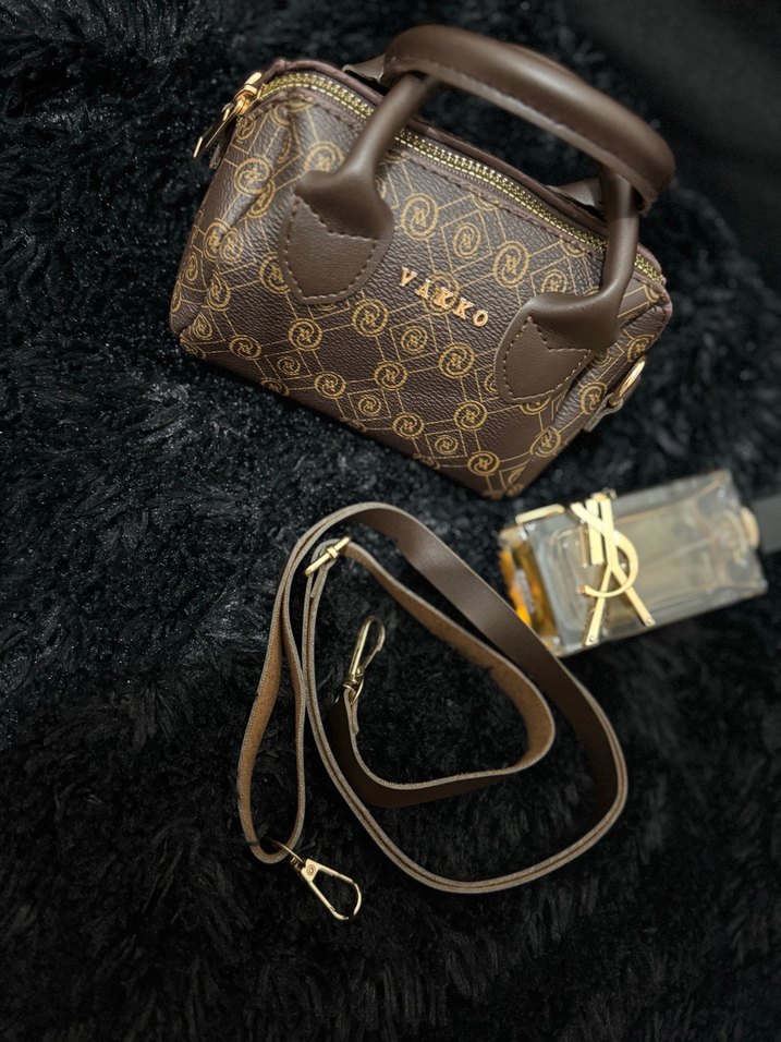 Kahverengi deri baskılı kadın çanta, tokalı detaylara sahip. Ayarlanabilir askısı ve kompakt tasarımıyla klasik sokak stiline uygun.