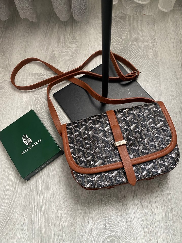 Kahverengi deri, gri baskılı desene sahip, kemerli detaylı omuz çantası, trend sokak tarzı için uygun.