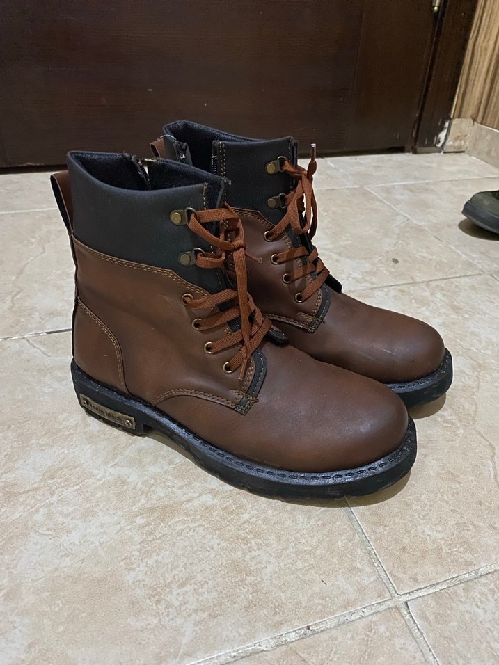 Kahverengi deri biker botlar, günlük kullanım için kemerli detaylı ve bağcıklı tasarıma sahiptir. Dayanıklı tabanlı, trend sokak stili için uygun.bir kere giyildi