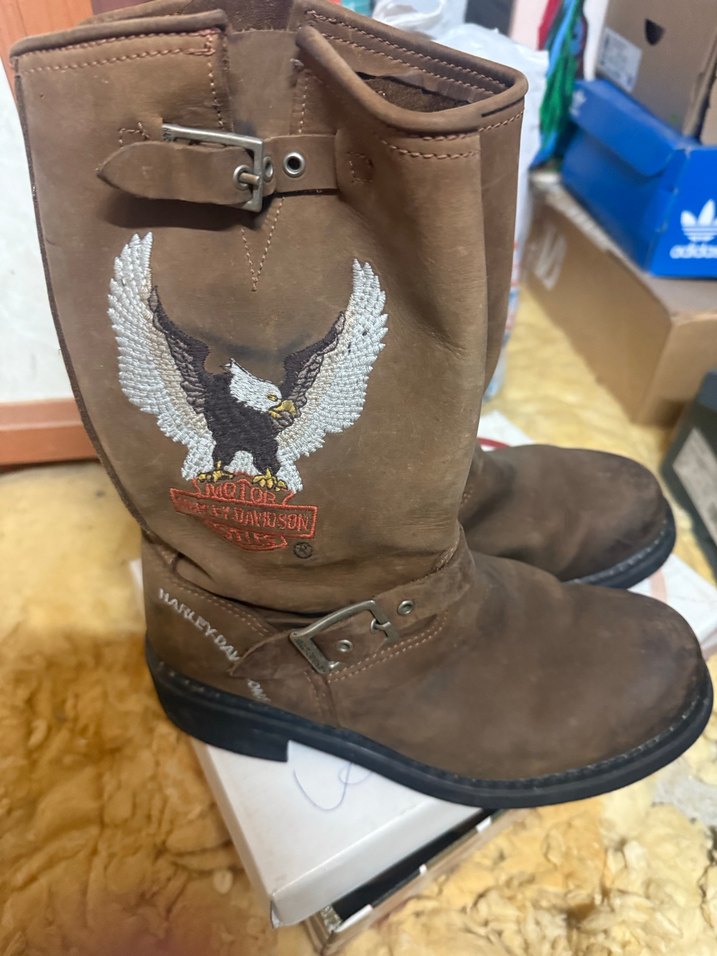 Yüksek topuklu, tokalı kahverengi deri biker botlar, kanatlı kartal baskılı. Sokak stili için uygun.