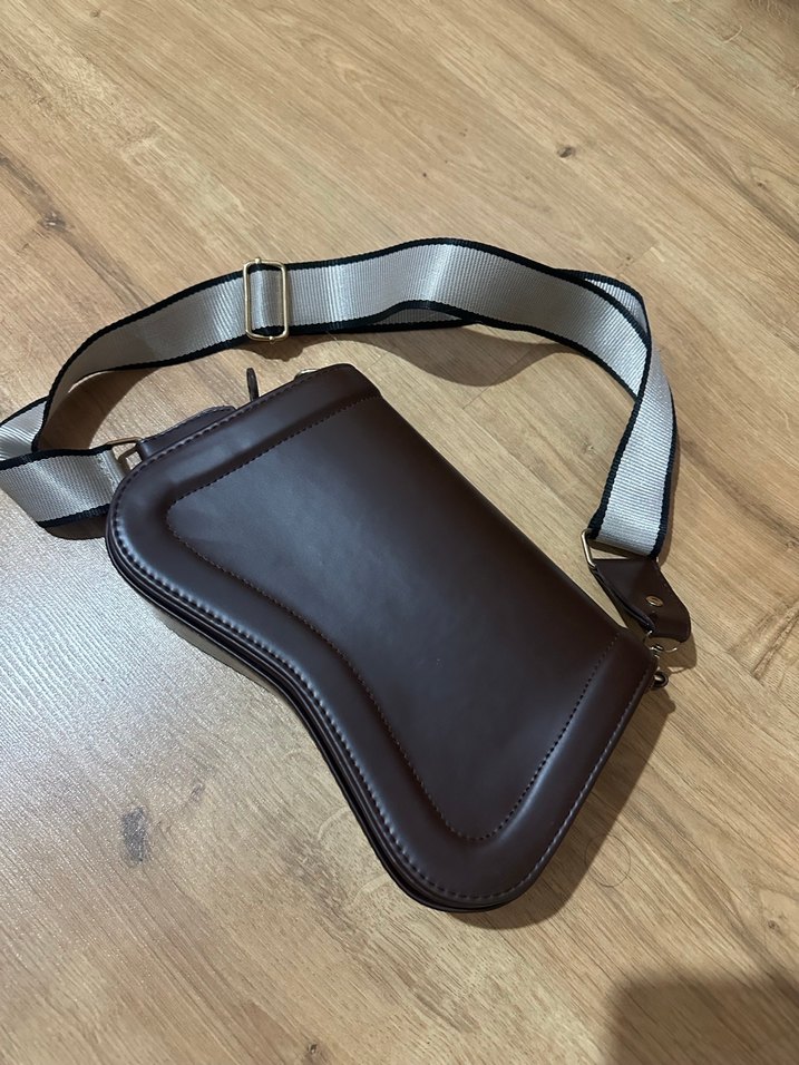 Kahverengi deri, tokalı biker tarzı çanta, ayarlanabilir askılı, günlük kullanım için uygundur.