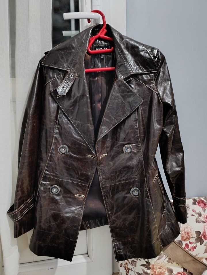 Düğmeli ön ve kesik yakalı koyu kahverengi deri biker ceket. Normal kesim ve askılı kollara sahip, günlük sokak stili için uygun.