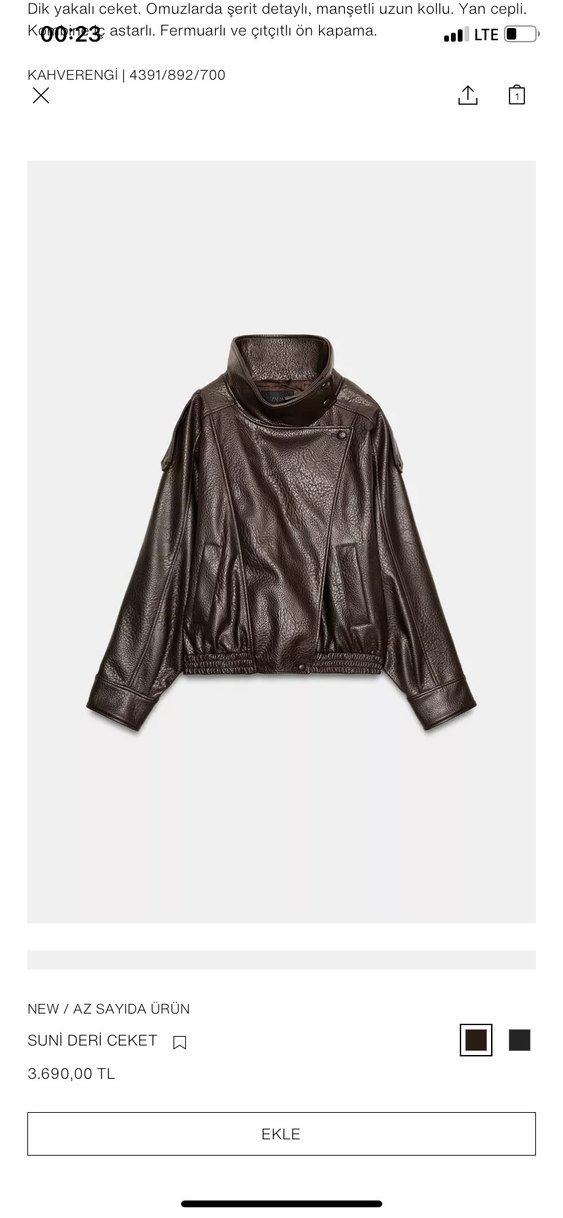 Kahverengi deri biker ceket, yüksek yakalı, uzun kollu ve kemerli bel detayına sahiptir. Minimalist tasarımı günlük kullanıma uygundur.
