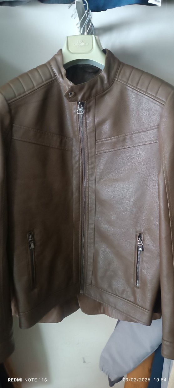 Kahverengi deri biker ceket, notalı yaka ve uzun kollu. Regular fit kesimi ve günlük kullanıma uygun midi uzunlukta.sifir ayarında asıl rengi ilk görseldekidir