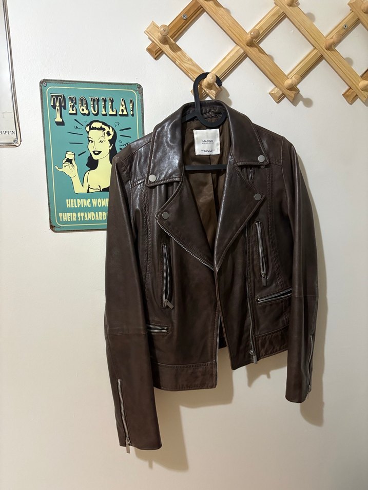 Kahverengi deri biker ceket, notched lapel ve tokalı detaylara sahiptir. Gerçek deridir, sorunu yoktur.