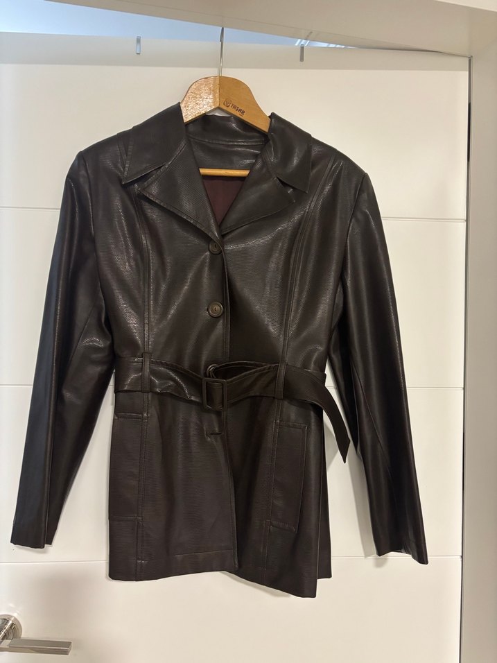Koyu kahverengi deri biker ceket, kesik yaka ve kemerli bel detayına sahip. Askılı kollu, normal kesim, ofis kullanımı için uygun. göğüs 50 omuzdan bıy 70 cm infinit markadır. Sorarark alın. Bir ikimkez ancak giyildi
