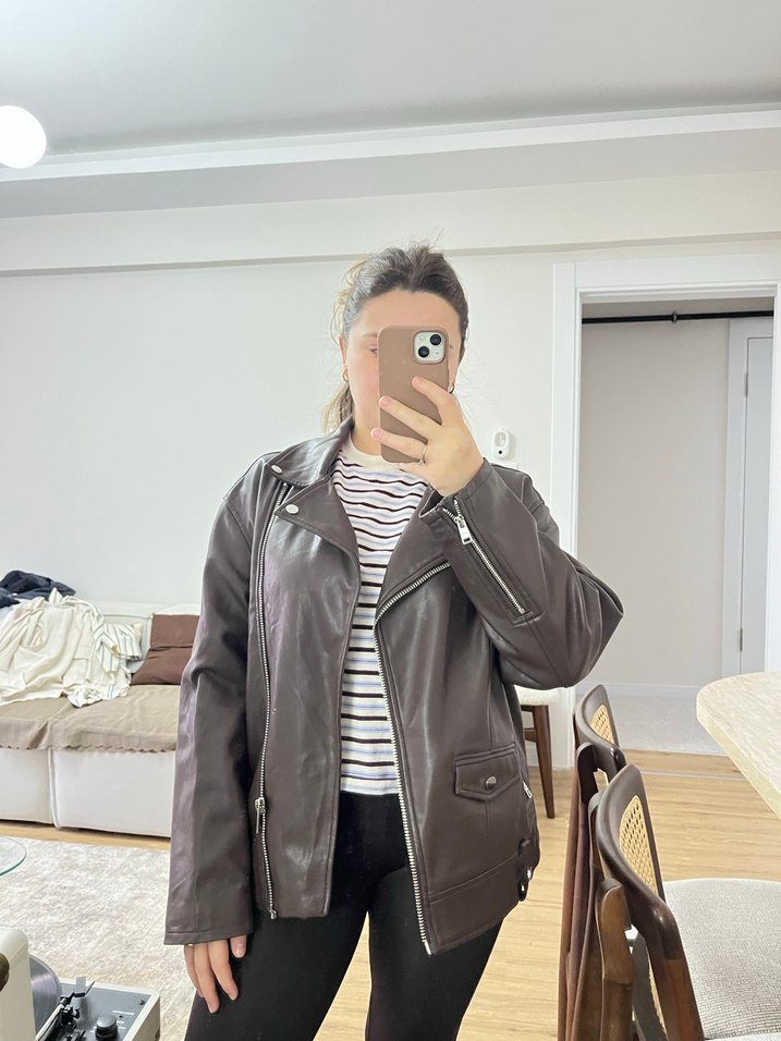 Kahverengi deri biker ceket, kesik yaka, uzun kollu ve tokalı detaylara sahiptir. Günlük kullanıma uygun, rahat kesim ve desensiz stilde tasarlanmıştır.