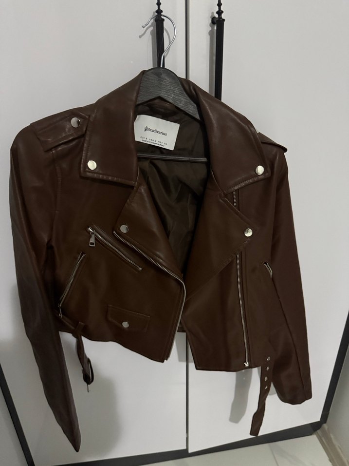 Kahverengi deri, sıkı kesim biker ceket; yakası keskin, tokalı detaylıdır. Normal midi boyda, askılı kollu ve baskılı desene sahiptir. Günlük kullanıma uygundur.