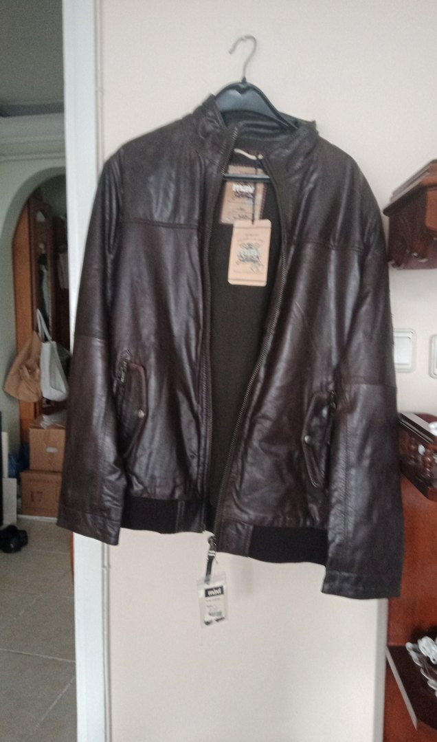 Kahverengi deri biker ceket, kemerli tasarım, bisiklet yaka ve uzun kollu. Günlük rahat kullanım için normal boy ve regular fit.