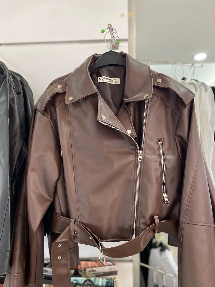 Kahverengi deri biker ceket, kemerli bel, çentikli yaka ve strappy kollara sahiptir. Midi boy ve düzenli kesim ile günlük kullanıma uygundur. Her beden mevcuttur