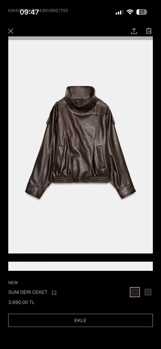 Kahverengi deri biker ceket, bol kesim, yüksek yakalı ve kemerli detaylıdır. Minimalist ve avangart tarz sunar, günlük kullanıma uygundur. Uzun kollu, midi boyda. NEW.