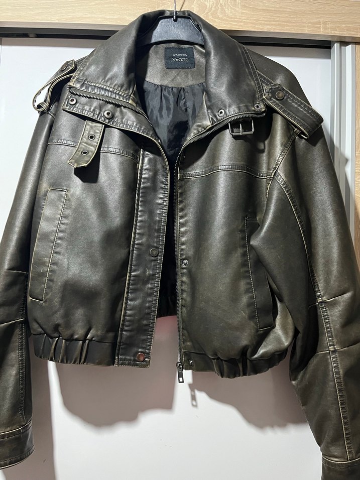 Kahverengi deri, kemerli ve yakalı, dar kesim biker ceket, günlük kullanıma uygun şık ve rahat bir seçim. kol boyu=52cm boyu=46cm eni=46cm