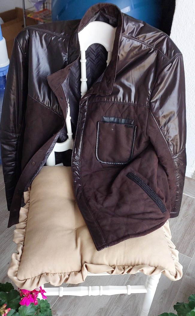 Kahverengi deri biker ceket, kemerli ve kesik yakalıdır. Strappy kollu, normal ve midi boyda, sokak stiline uygundur.