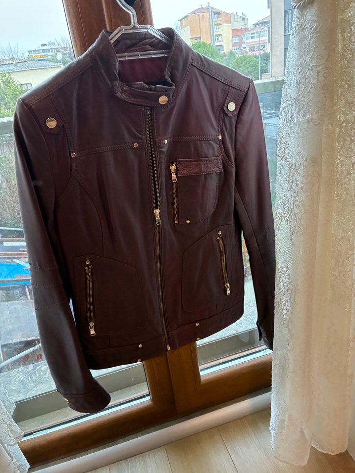 Fermuarlı cepleri ve yakası bulunan kahverengi, dar kesim deri biker ceket. Uzun kollu ve midi boyda, günlük sokak stiline uygun.