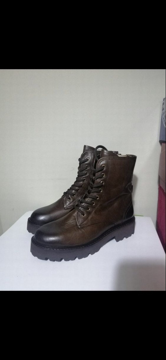 Kahverengi deri, platform topuklu, kemer detaylı biker kadın botu. İç kısmında kamuflaj desen bulunur. Günlük sokak stili için uygun.