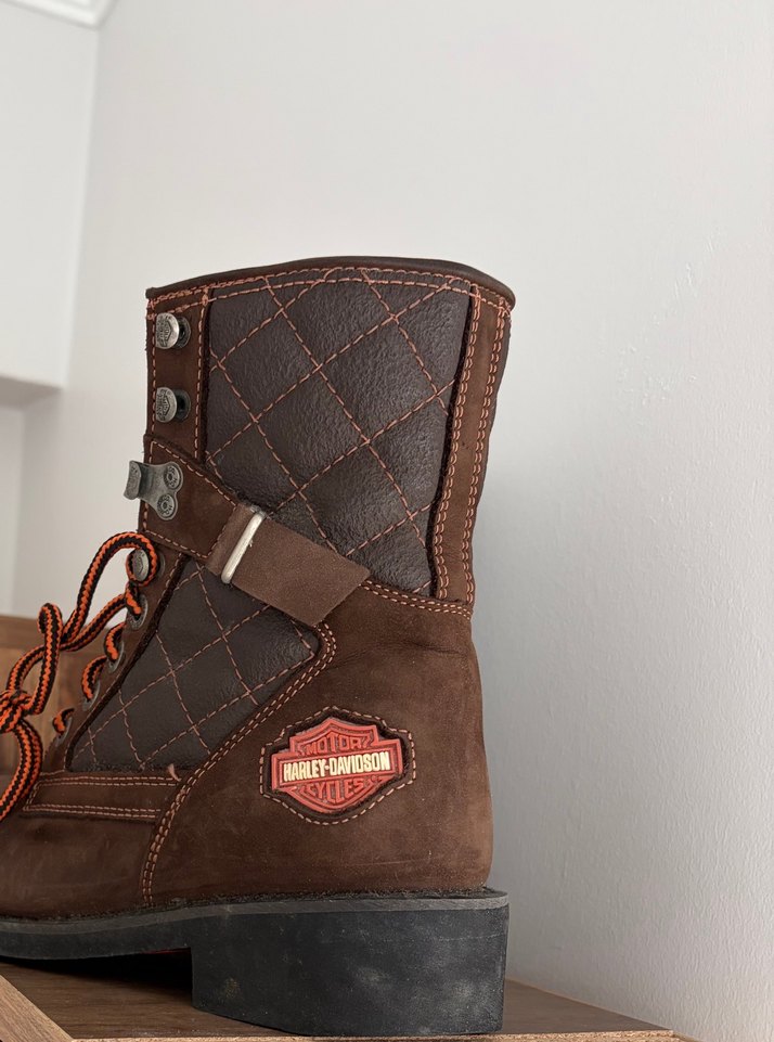 Kahverengi deri biker botlar, dolgu topuk ve tokalı detaylara sahip. Vintage tarz, kapitone desen ve Harley-Davidson logosu bulunur. Günlük kullanıma uygun.