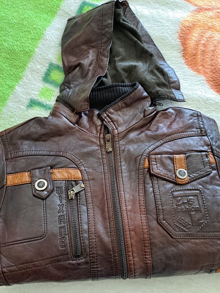 Kapüşonlu, fermuarlı ve tokalı cepleri olan koyu kahverengi deri biker mont. ve uzun kolludur, günlük kullanım için uygundur.