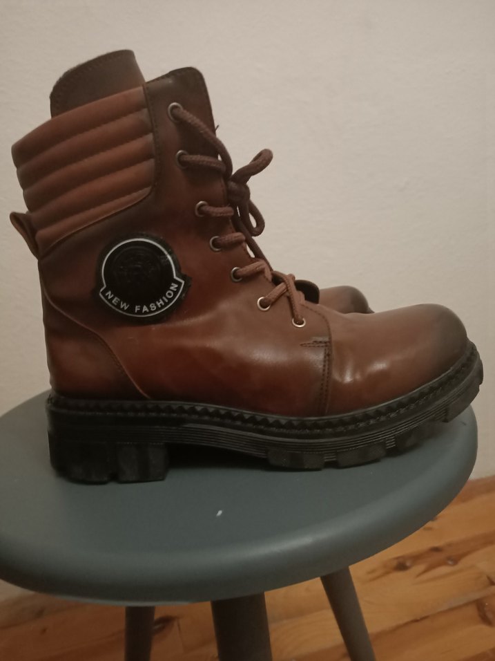 Kahverengi deri biker tarzı kadın bot, yüksek topuklu, tokalı ve baskılı detaylara sahip. Günlük şık kullanıma uygun. diğer marka