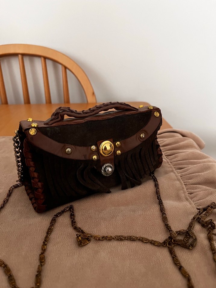 Hakiki deri el yapımı mini çanta.Koyu kahverengi deri, tokalı kapanış ve desenli detaylara sahip bohem tarzda kadın çanta. Zincir askılı ve püskül detaylıdır.
