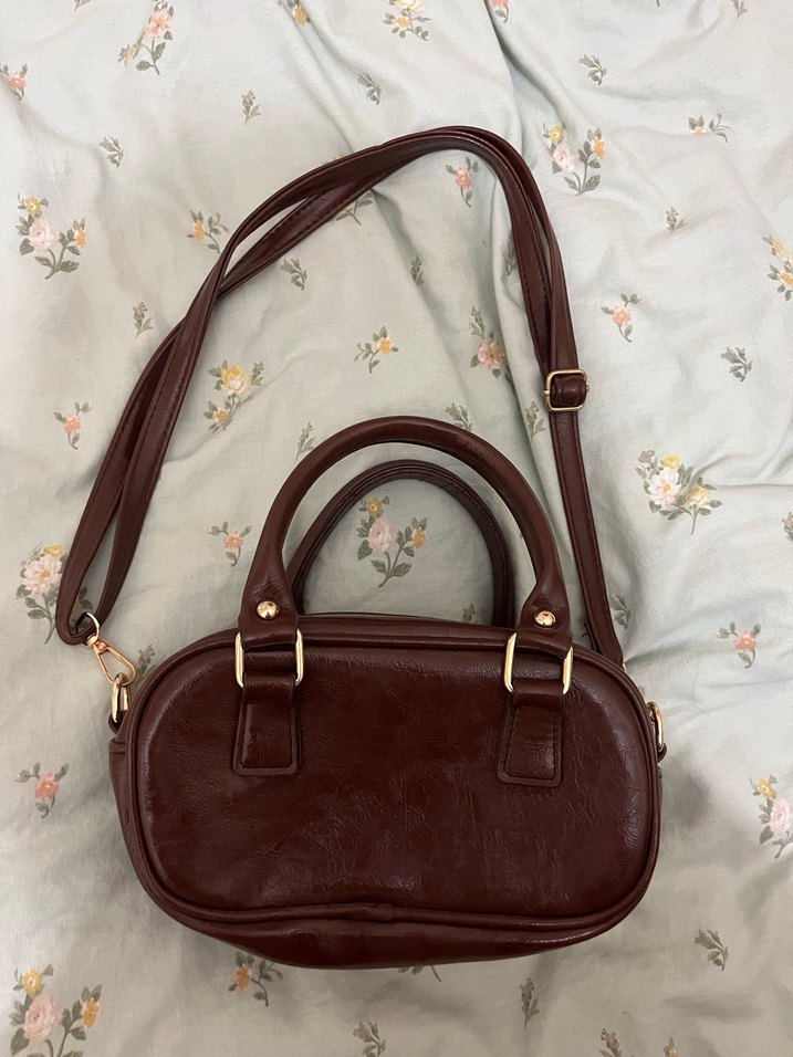 Kahverengi deri, tokalı kayışlara sahip bohem tarzda kadın çanta. Kısa saplar ve ayarlanabilir omuz askısı bulunur.