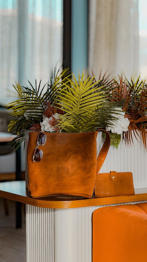 Kahverengi deri, parlak yüzeyli, tokalı ve desenli kadın çantası. Bohem, hippie ve retro tarzları için uygundur.