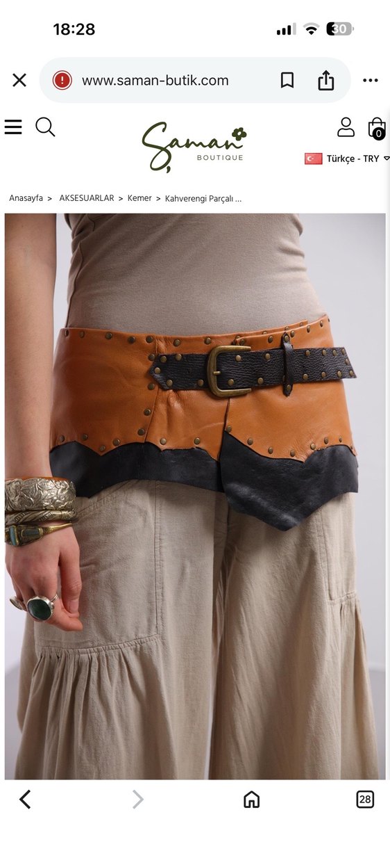 Kahverengi deri kemer, koyu renk detaylar ve metal perçinlerle bohem tarzda tasarlanmıştır. Avant-garde ve modaya uygun bir görünüme sahiptir.