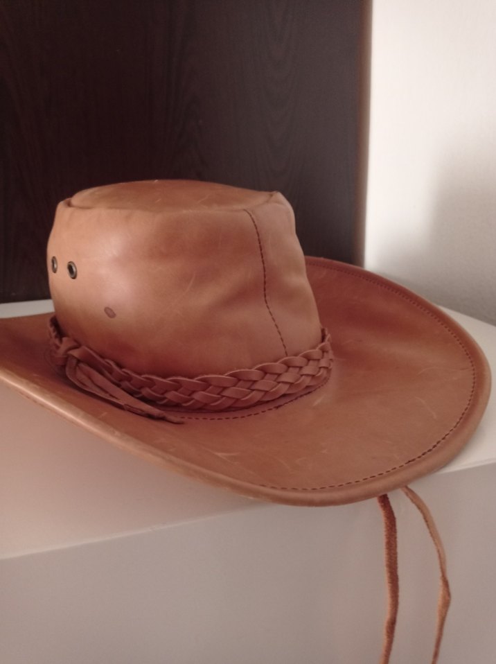 Parlak kahverengi deri kadın şapka, örgülü bant ve tokalı detaylarla bohem tarzını yansıtıyor.