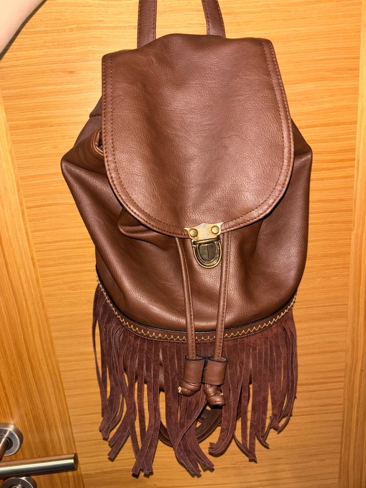 Kahverengi parlak deri sırt çantası, tokalı kapak ve püskül detayları ile bohem tarzını yansıtıyor. Günlük kullanım için uygundur.