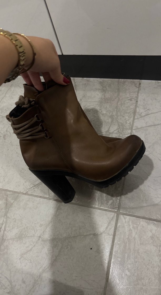 Kahverengi deri, tokalı, kalın topuklu kadın botu, bohem tarzıyla günlük kullanıma uygundur.