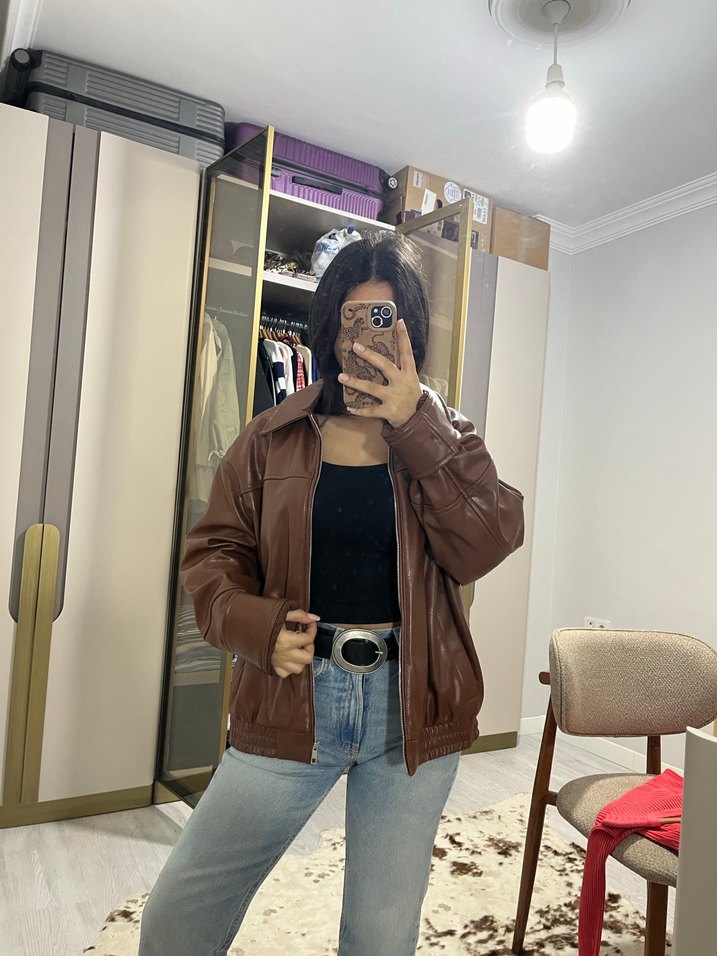 Kahverengi Deri Bol Kesim Ceket