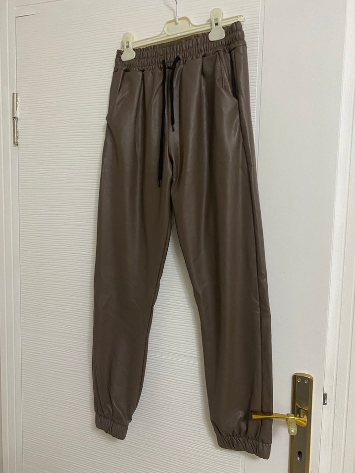 Kahverengi deri, bel detaylı, bol kesim ve lastikli bilek ucu olan kadın pantolonu. Günlük rahat kullanım için uygundur.