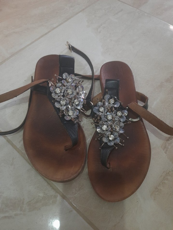 Kahverengi deri, boncuklu çiçek detaylı, tokalı dolgu topuklu sandalet, bohem tarzda günlük kullanım için uygun.