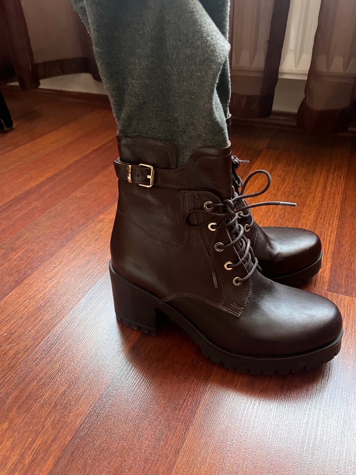 Divarese 38 numara Kahverengi deri bot, blok topuklu 1kez giyildi çok yeni durumda