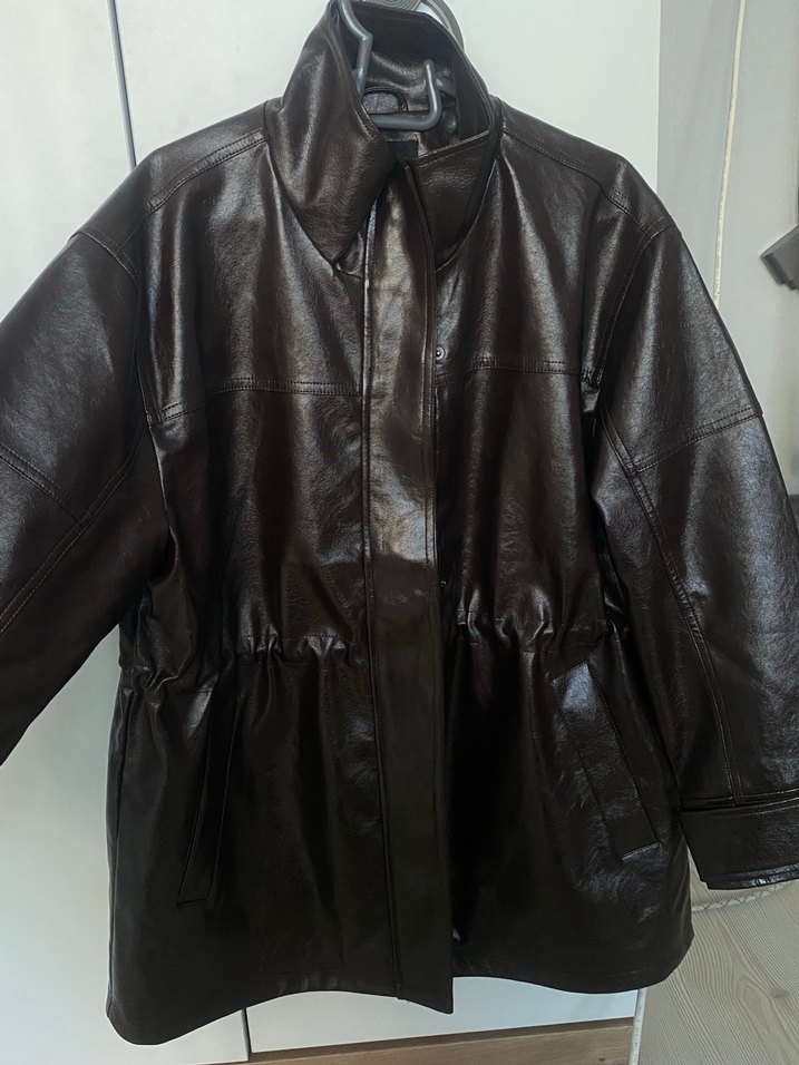 Kahverengi deri, dik yakalı ,uzun kollu,midi boy kadın deri ceket. Klasik biker tarzında, Paris esintili. Hiç giyilmedi yeni belinde ayarlanabilir lastik var hem fermuarlı hem çıtçıtlı