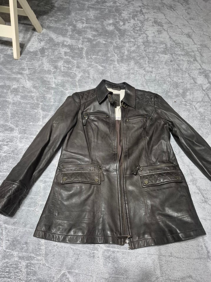 Kahverengi deri biker ceket, kemerli ve kesik yakalıdır. Uzun kollu, normal kesim, günlük rahat sokak stiline uygundur. Hakiki deri