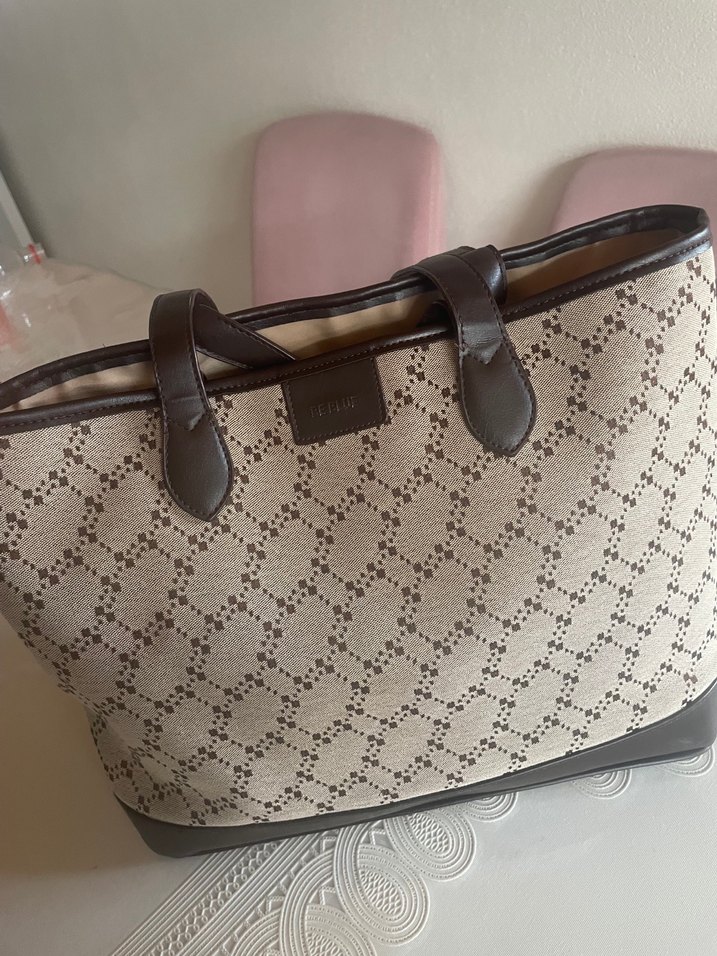 Kahverengi ve gri tonlarda, deri saplı, tokalı ve desenli modern klasik tarzda kadın çantası. Günlük kullanıma uygun, Paris şıklığı katıyor.