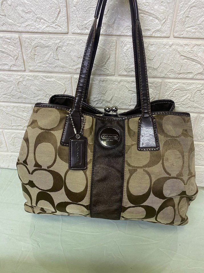 Kahverengi deri, baskılı desenli ve tokalı detaylı kadın çantası, günlük kullanım için uygundur. Orijinal