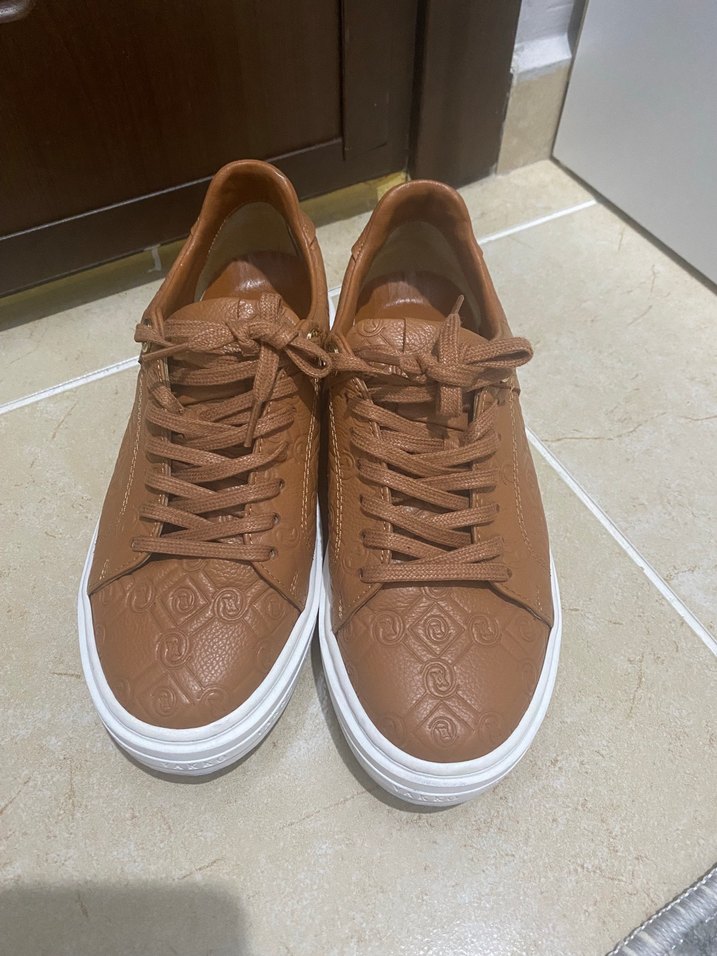 Parlak monogram desenli kahverengi deri, bağcıklı kadın spor ayakkabısı. İnce topuklu, günlük kullanım için uygun. Bir kaç defa kullandım deformesi yoktur orjinaldır tr mağazadan alınmıstır
