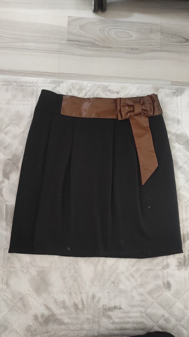 Kahverengi deri fiyonk kemer detaylı, diz boyu ve dar kesim, rahat etek. Deri detayı eteğin orijinalinde mevcut olan bir detaydır. Ofis kullanımı için uygun, gotik tarzda. Ürün az kullanılmıştır. Defosu yoktur, yeni gibidir. Önünde hafif pileleri mevcuttur. Astarsızdır. Arkasında fermuar bulunur. Ölçüleri; belden boyu 48 cm, bel genişliği 38 cm, etek genişliği 54 cm'dir.