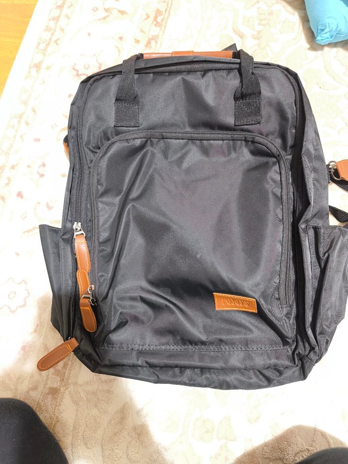Kahverengi detaylı siyah anne bebek çantası, çoklu bölmeler ve sağlam saplara sahip, kullanışlı tasarım.